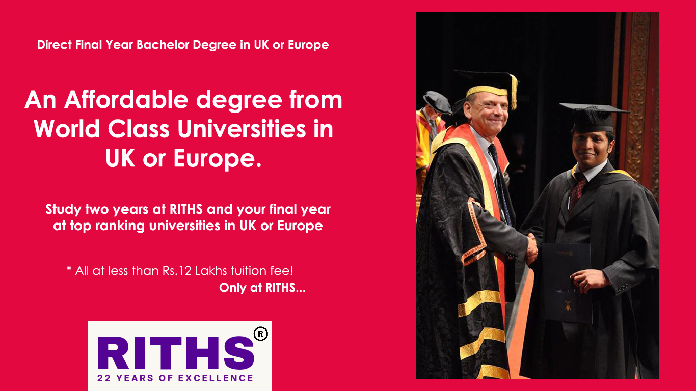 Studying a three-year degree at a UK university typically costs around Rs. 60 lakhs, including Rs. 45 lakhs for tuition fees and Rs. 15 lakhs for living expenses. Through the RITHS program, you can significantly reduce these costs by studying the first two years at RITHS with negligible tuition fees and no UK living expenses, and only paying for one year of tuition and living expenses in the UK. This approach saves you approximately Rs. 40 lakhs while still providing the benefits of a UK degree, including a PSW work visa and full degree credits.